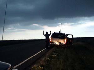 Once in Shamrock we noticed that we had two possibilities. There were some showers in an unorganized manner in the panhandle of Texas, and another cell that appeared more favorable to the south near Childress. The showers to the north appeared to be near a boundary and had better backing winds to favor shear and potentially rotating storms, however we decided to go for the cell to the south which was already better established.
