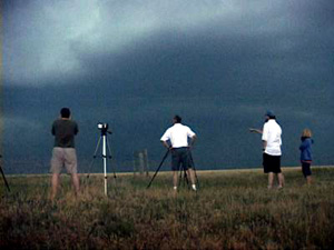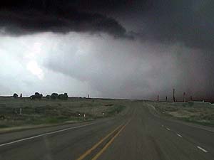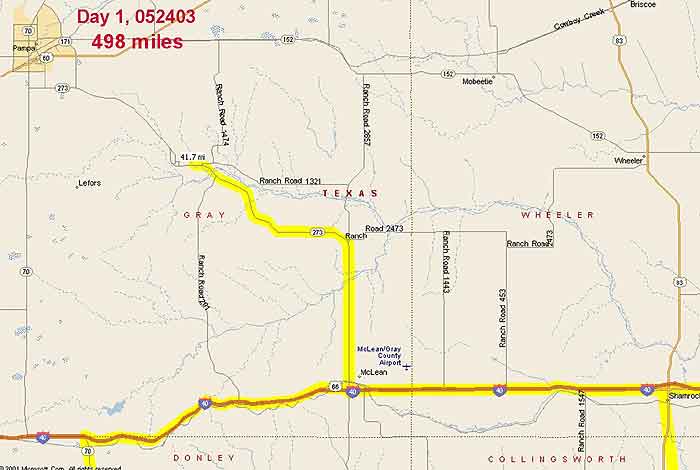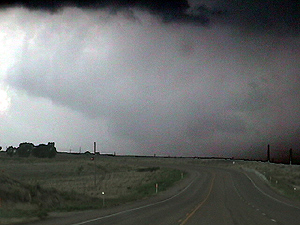 In the process of traveling through the southwest corner of Oklahoma to get back towards Shamrock, TX, we almost hit a road runner. That's something a little strange for people from Minneapolis. When people of the north think of a roadrunner, they also think of the coyote. But there was no coyote. I'd also like to add that roadrunners are not nearly as large as the cartoon depicts. Once we got on the paved roads again, near Hollis, TX we headed back to Shamrock at 83/I40. By this time we were getting reports the cells in the Pampa area were severe. We then noticed a nice updraft, and Doug Kiesling called that the cells were tornado warned. We high-tailed it to Mclean, and headed north on 273. On the radio we heard that a couple brief tornado touchdowns were spotted just east-southeast of Pampa, which was very near our location. At this time we noticed a very ominous lowering, which was very apparent to be a wall cloud with potential tornado below it. Later we found out that the tornado reports came from a research team. The timing, position and validity of the tornado report all come together to lead us to believe that the brief view we got of the wall cloud and lowering may indeed have been a brief tornado.