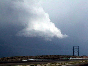 Once this cell had passed over us, we got in the vehicles due to the pending rain and drove into the cell. A little data indicated that a severe cell had cropped up just to our south near Carlsbad, NM. We high tailed it south along the west side of the multicellular cluster of storms to get to the southern cell. While trying to get closer we ran into a beautiful wall cloud and mammatus. Together with the lightning truely was an amazing part of this chase. View time lapse video of the wall cloud dissipating. [2.4 MB]