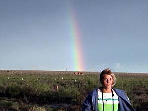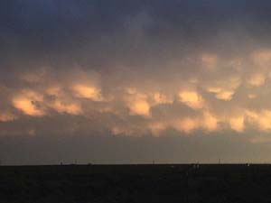 After following this cell through Carlsbad the cell began to bow and gust out. We followed the storm until the end to witness a gorgeous rainbow and sunset-lit ragged mammatus. View time lapse video of the mammatus as the sun sets. [1.7 MB]
