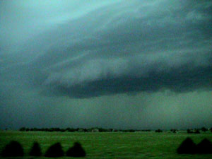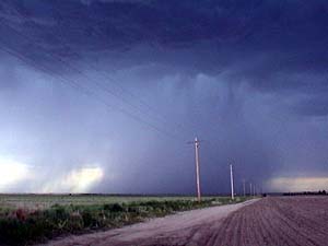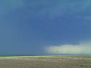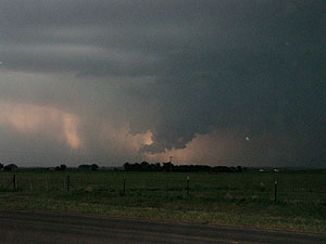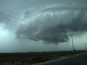 The amount of outflow and inflow through that area was amazing. Our guests were all outside as we watched a large dust cloud heading toward us. We got everyone in the vehicles just as we got sand blasted. We stayed with this cell for quite some time and watched a beautiful meso and wall cloud evolve just before getting undercut by the outflow and dying. View time lapse of the wall cloud developing. [2.0 MB]