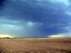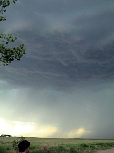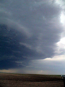 Sure enough once we got near Hoyt, CO the cell met us and had an enormous amount of inflow and outflow winds. We were watching a wall cloud in the distance when we noticed a sharp wind shift coming out of outflow and into inflow. This peaked our interest. We drove farther into the inflow winds to get away from that "couplet" area so that we could get out and take a look at the clouds above the wind shift boundary. Sure enough a beautiful meso was working with rapid rotation. View time lapse video of the mesocyclone. [1.6 MB]