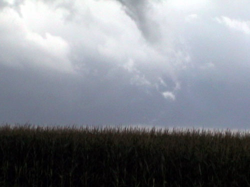 ![]() I took a call from Scott Weberpal and while on the phone I noticed some rising scud between me and the wall cloud in the distance. There appeared to be some rotation to it and perhaps even a funnel above. The scud was pure white from my vantage point and seemed to rise right out of the corn. It was a very cool sight to see.