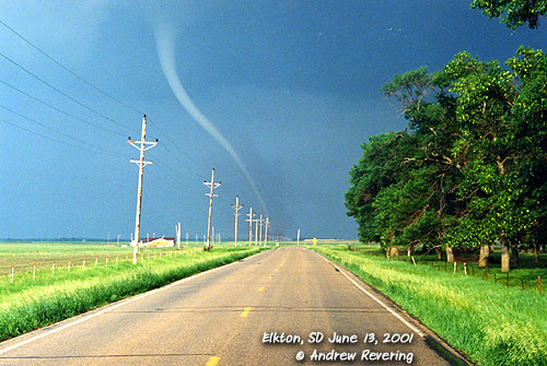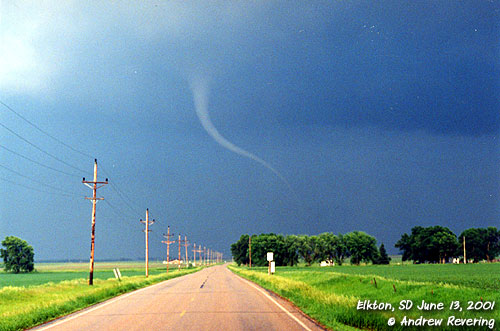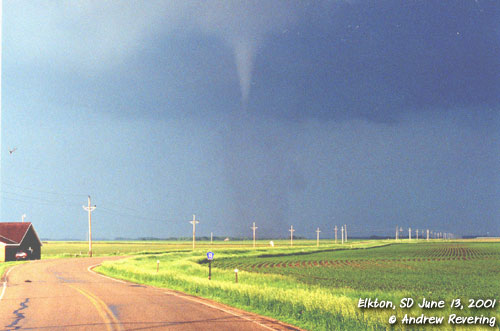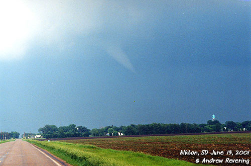 We were able to get around the south side and eventually followed up the west side of it as we watched a wall cloud develop. Following the storm NNE we were able to view a nice funnel forming west of Elkton, SD. While we maneuvered closer to the funnel we watched it slowly form half way to the ground and then touch down just as it got to the Minnesota line on Highway 14.