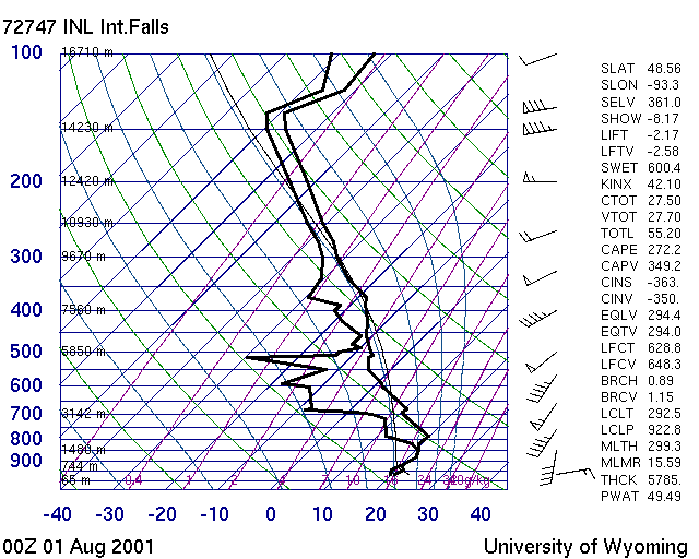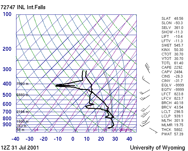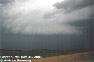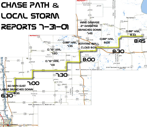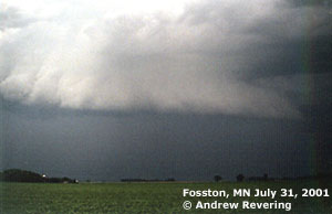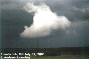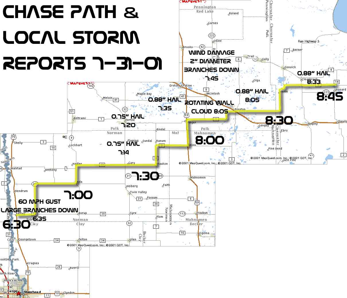 Storm Reports Mel was gracious enough to allow me to ride along with her on the chase for the day so because of that I did go. But with my own personal uncertainty if I were to drive alone, I'm sure I wouldn't have gone. I'm glad I opted to go. Mel and I left at around 12:30 p.m. with an initial target of Alexandria. We met Peggy in Alexandria and decided to go further to the northwest as Todd (Sprinky) and Doug (LightningBoy) both were on top of things and told us that there was a nearby cell to the southwest of Fargo, moving to the NNE at ~30 at this point. As we drove closer to Fargo it was nearing 5:30, or was projected that we'd be in Fargo around that time. With the size of the town and time of day we didn't want to go through for fear of getting caught in traffic. So instead from Barnesville we took 9 north in hopes to intersect the storm somewhere NE of Fargo. Once we got between Averill and Borup we noticed the cell in question and found some nice "structure" where the wall cloud should be. However, after looking due west of us we could see a new thunderstorm blowing up. I can't say I've personally ever see a storm pop up as fast as this one did. Again, my uncertainty didn't help the decision making process, so I'm very glad Mel and Peggy were there to decide to take that southern cell instead, even though at this point it was no more than a rain shower. We headed west out of Borup towards the little town of Perley in an effort to cross the river into ND and get on the back side of that cell before it turned severe. Unfortunately this thing exploded into a severe storm faster than I have ever seen. We were driving south for a short jog before we were to turn west and initially saw some light rain in the far distance, and before we were able to head west again, a matter of maybe a mile, a huge cloud of heavy rain and hail was upon us. We scampered a bit to get out of the way of this storm, allowed it to pass just to our east with no more than maybe quarter size hail and began to follow it to the ENE. From here on out we meandered from Perley to Leonard which is to the NW of Bemidji from around 6:00 to 9:00 or so. During almost the entire duration of that period we had a rotating wall cloud or series of wall clouds. Maybe as many as 3 at one time. Very defined, nice structure, at times perfect vertical motion. Unfortunately no tornado ever dropped that we could see. Occasional wind damage along our path but not much else. But what a fun chase! It was thrilling to be able to keep up with a storm that was moving around 50-60mph for so long and yet have the storm maintain such strength.