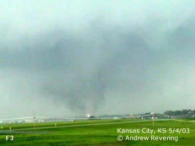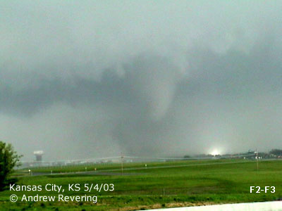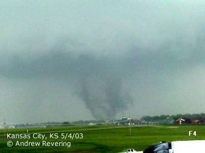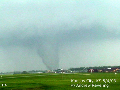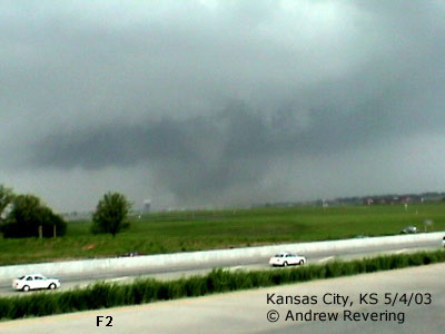 ![]() ![]() Here the tornado showed it's ugly head. We exited on the south side of the road, across from Kansas Speedway and watched as the tornado grew in size and became a wedge just before getting obscured by rain and distance. Above us was a Fox news helicopter, but from their location they could not see the wedge, even though it was just below them. The meso was so wide and low that the chopper would have to have been much lower to see the wedge under the meso. But in doing so they put their chopper at great risk, so they could only view damage. According to the damage report and accounts from the other side of the tornado, in the images below the 1st image the damage was rated at F2 but sequentially get up to an F4 destructiveness by the last 3 images, starting with the multi-vortex stage, which was confirmed by Mikey Kampmeier who was just west of the tornado on Parallel Parkway. Here it was located just south of Parallel Parkway near 435. Just after we lost view of the tornado is where it took the life of an 81 year old man and his dog who were outside trying to seek shelter when the tornado struck. Later, the man's belongings were found as far away as Chillicothe, MO, some 80 miles to the northeast of his home. Another story heard on a Kansas City TV station said that somewhere in this stretch a woman was taking a bath, her home was destroyed and she was found shortly after the tornado passed naked in a tree... virtually unharmed.