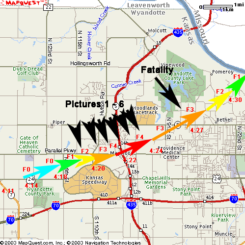 Jump directly to photos of this rated F4 tornado. The 00z model data looked quite incredible for Eastern Kansas and Western Missouri. Our intent with this data was to get on the western edge near the dryline, and just to the southeast of the low for initiation. See the data. Driving west we saw a cumulus field begin to develop between Wichita and Emporia. The decision was to head south-southwest to get in the middle of the cumulus field, thinking initiation could come from this area in a short matter of time. At about 11:45 a.m. we were in the vicinity of I-35 and 56 between Topeka and Emporia. A PDS tornado box was issued not long before this time. As the towers appeared to be moving at a pretty good clip to the northeast, we followed them in hopes to stay within the cumulus field as it developed while moving northeast. By 1:00 p.m. 3 PDS tornado watch boxes had been posted! And we were right in the middle of them. The 1:00 surface obs showed a temp of 77 and a dew point of 70 at Coffeyville, KS and behind the dryline Medicine Lodge was 84/30. Although this was farther south from our location, it gives a good indication of the strength of that boundary and the amount of instability ahead of the dryline. By 2:30 p.m. we were near Lawrence, KS watching towers develop around us. We ventured north to try to follow these storms as they developed, but it appeared as if they were multicellular. Farther west a very isolated cell developed on the dryline. For a short time we were derailed to follow this cell, but it quickly died as it's updraft was not high enough to get caught in the steering winds. Therefore it's slower movement than the dryline allowed the cell to fall back into the dry sector, and died. We then quickly turned around and headed back toward Lawrence as new towers were going up to our east along I-70. At 4:01 p.m. the NWS in Kansas City issued a tornado warning for Wyandotte County, KS, just west of Kansas City. Law enforcement reported multiple tornadoes on the ground and the storm was moving into Kansas City, expected to be there by 4:30 p.m. We had this storm in our view just ahead of us. We were in hot persuit. At 4:13 p.m. we were near Bonner Springs, KS approaching the toll booth. Here is where Doug Kiesling got spectacular footage of the first touchdown coming across I-70. This tornado barely missed the toll booth. By the time we got there, debris covered the road and the toll attendants were still in shelter. People were walking aimlessly in a daze along the road. Some looked to be covered in mud and perhaps splatterd with debris.... About a minute later at 4:14 p.m. we began to get in the damage path and we started having falling debris on us. There were feathers, paper and other larger pieces of debris falling from the sky, but the tornado was not yet in sight. It had to have been just ahead of us out of our view... perhaps rain wrapped. A few minutes later the National Weather Service issued a "Tornado Emergency" for Kansas City as two large tornadoes were reported on the ground. One near Platte City and the other in the northern half of the Kansas City Metro. This one in the northern part of the metro was the one we were about to intercept. According to a spotter I spoke to after the chase [Mikey Kampmeier] the tornado footage taken by Doug Kiesling is the tail end of what he saw approaching the speedway. According to his account, the tornado never dissipated after coming through the toll booth area. The tornado got rain-wrapped when Doug lost sight of the tornado, but from Mikey's location the tornado was still very visible from the ENE. It continued to grow into the monster we were about to witness as it approached the Kansas Speedway from the WSW.