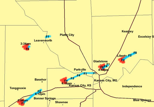 ![]() By 4:15 p.m. we had come to I-70 and 110th street on the northwest side of Kansas City. On the map below, you can see that the tornado was roughly 1.5 miles from us. On the second image, you can see the tornado tracks the NWS plotted. The storm we chased was the middle storm.