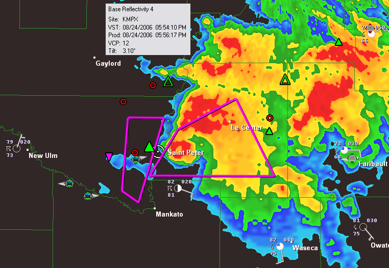 I feel like the protector of Searles, MN. First July 14, 2003, and then today. 4 miles from Searles. Absolutely incredible. What are the odds? Population 110. I don't know that I've ever actually seen the center of the city, if there is one. So my day went like this… last night I was all confident forecasting New Ulm. But when some of the RUC data was coming out showing a very warm 700 temp of 12-14c over most of SW, S, and C Mn, I had to revise my forecast and left at 200 for the eastern edge of what I thought the cap location would be. So I headed towards New Prague and Norwood. When I got to Norwood I met up with Rory Groves, which was awesome since I haven't chased with him in forever. I then decided to check the 3pm mesoanalysis and was shocked to see RUC cooled off the 700 temps by 2-3 degrees! Apparently after MPX, ABR, DVN and maybe another site like OMA did an 18z balloon launch, it was realized that the model was running too hot. It was an instantaneous realization that it was GAME ON! I immediately revised my target, and advised Rory of the change of events, and he agreed going to New Ulm was a good decision. By this time Beau, Meredith, Froggie, Donya, Sherry, Karen, Meagan, Scott, Mike, Rich, Bill & Cullen were all in New Ulm. (did I get everyone?) Joel was in Mankato, and Rocky & Gene Rhoden were in Redwood Falls. Somewhere north of New Ulm I am talking to Meredith and I hear Beau say 'gimme the phone', and he advised me that a cell was popping over Searles, just south of New Ulm by like 4 miles or something. This was RIGHT on the boundary and it was obvious that this was the show. I immediately made the rounds and called everyone in the list above that I could think might have not gotten the information so we could converge on that cell which was sure to go gangbusters… as we later saw it did. Arriving at the cell, we ran into a situation where we pulled off and looked at the 30-35 tilt1 dbz core over Comfrey and what appeared to be a new updraft base just to our west by a mile or two. I learned from Stuart, NE June 9, 2003 from Bill Doms, Peggy Willenberg and Melanie Metz, that even if you have a 'severe' storm just to your east, and you have a new updraft that has GOOD rising vertical motion, that you should stick with what moves. (I just made that up, but that's a good saying… "stick with what moves".) So I mentioned that to the group and suggested we stay put and watch this thing to our west. Radar was actually hinting that this wasn't a bad idea given a pretty good VIL value and some increasing reflectivity behind the first updraft. It wasn't long and…