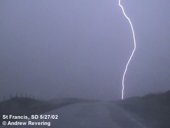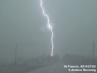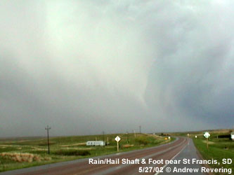 Travelling around the cell from the north side, we got to Rosebud, SD and headed south toward St. Francis. It was at this point where we really began to see the core of the storm well. It was a big wet monster. From our location we could not tell if this was a supercell, line or multicellular storm. I still don't know, but the assumption is that this was the first cell which began the formation of a line. However, throughout the life-cycle the storm appeared to be rotating. |